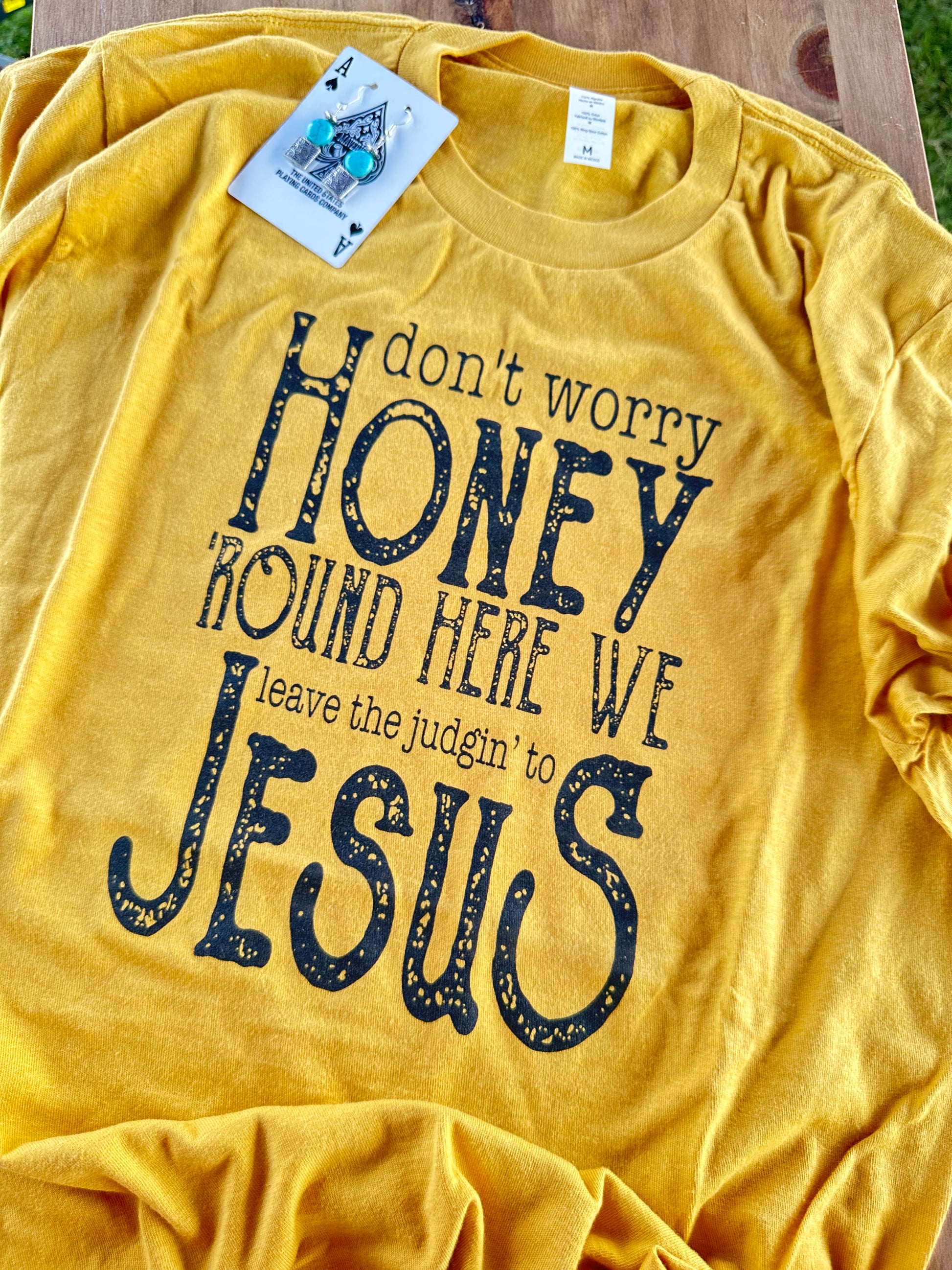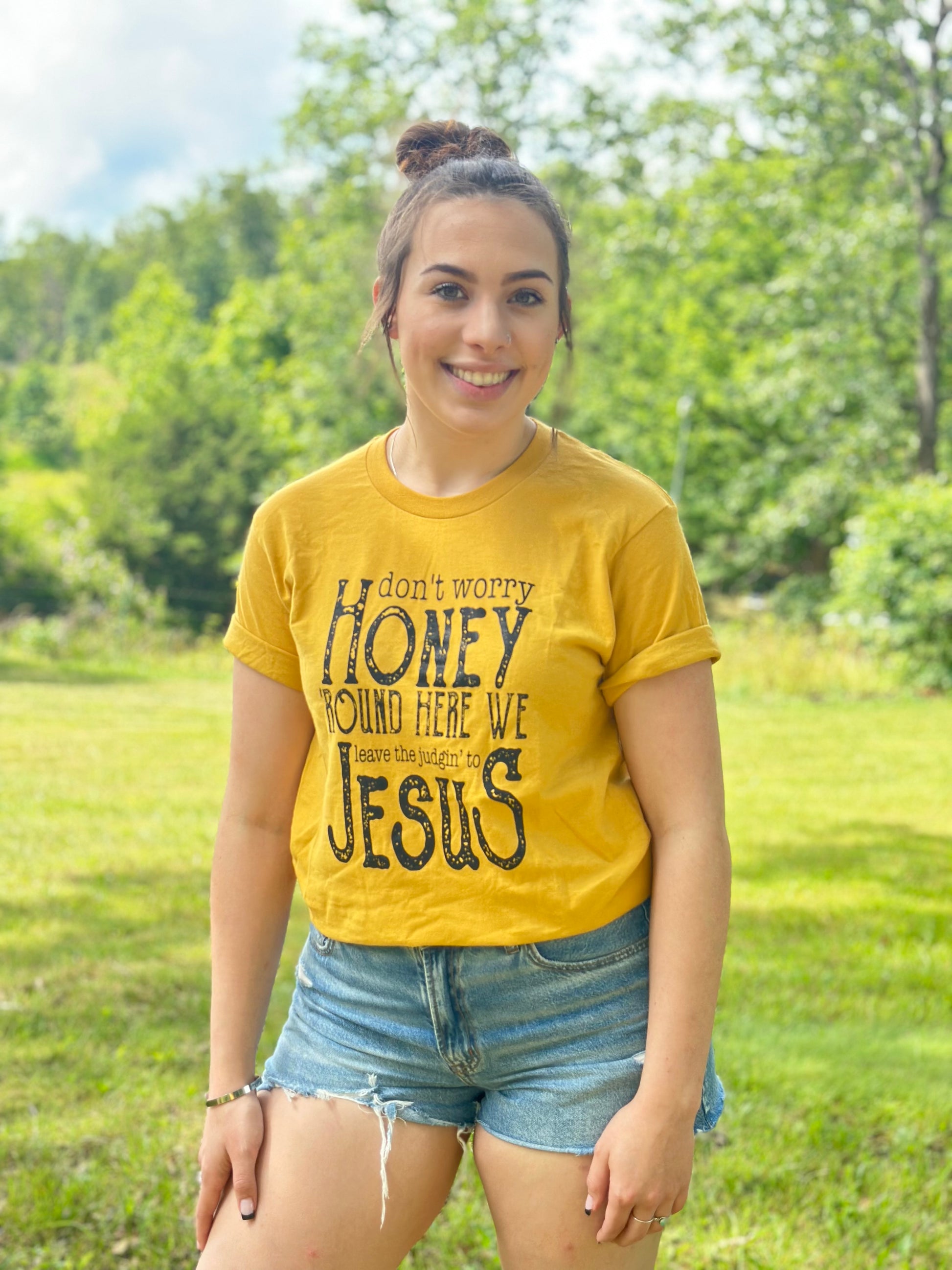 Don't Worry Honey Round Here We Leave The Judgin To Jesus | Comfy Graphic Tee | Unisex Soft T-shirt