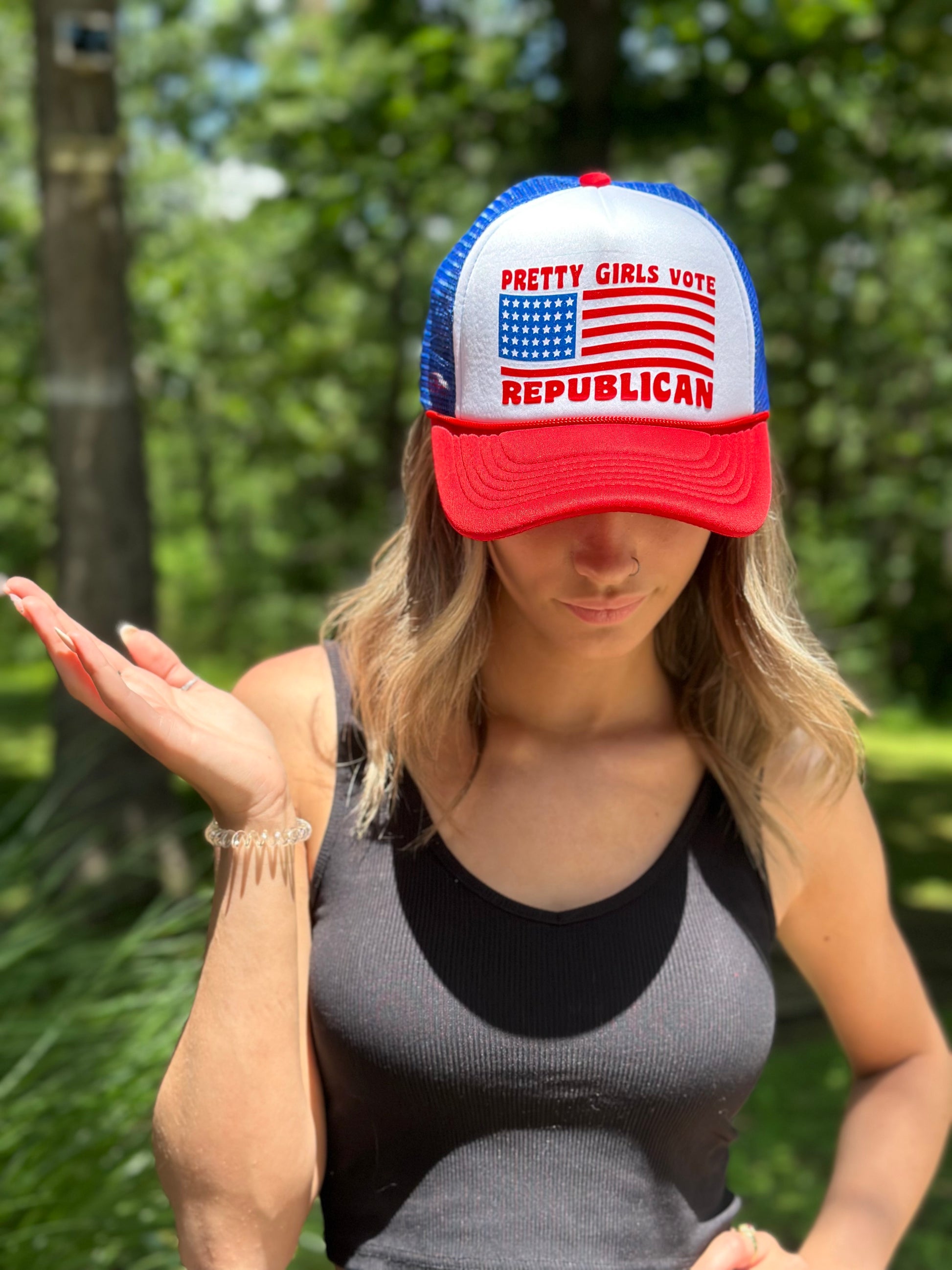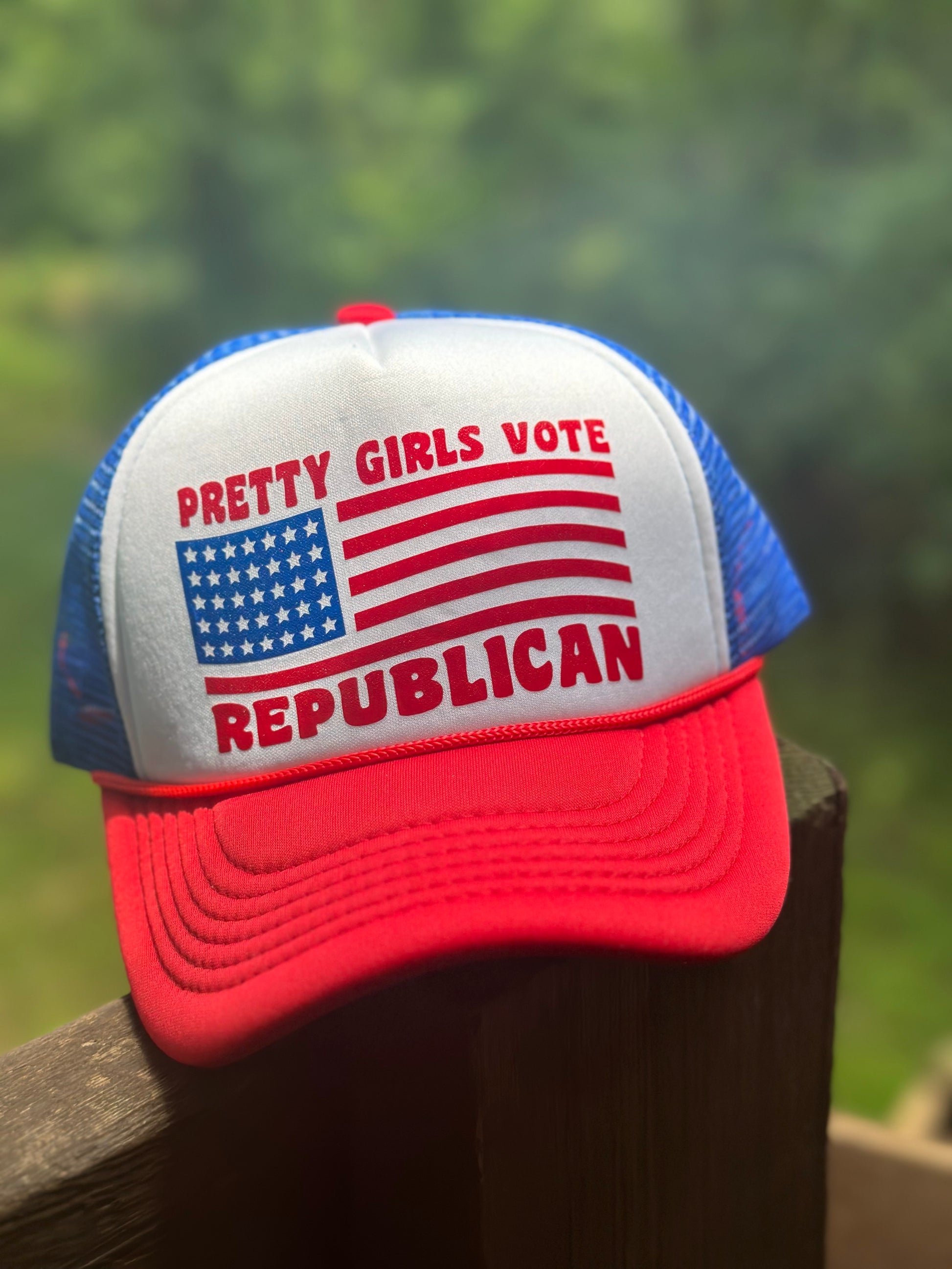 Pretty Girls Vote Republican Trucker Hat | Trending Ball Cap | Red White and Blue Snapback| One Size Fits All